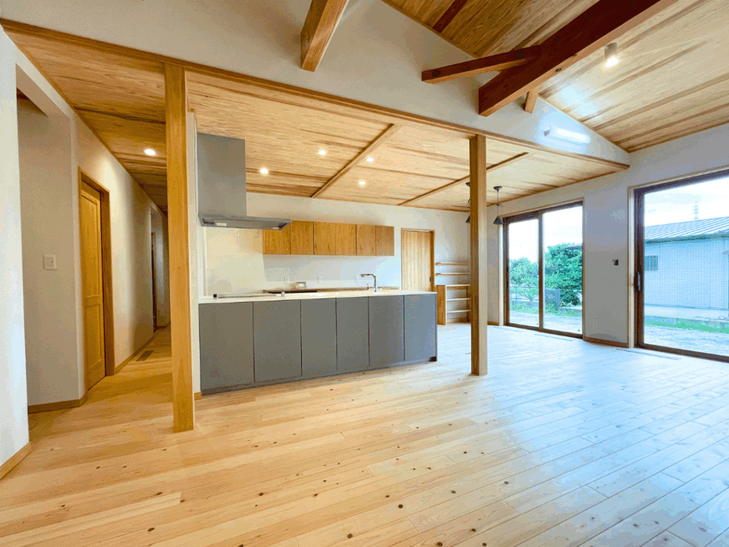 視線が上へと抜ける、開放的なリビング空間。 木の梁をあえて見せることで、素材の力強さとデザイン性を両立しています。 昼は明るく、夜は照明の陰影が美しく映える設計です。