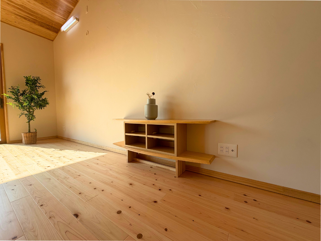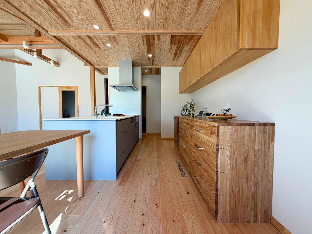 室内に一歩足を踏み入れると、無垢材のやさしい表情と木の香りが広がり、ほっと心がほどける空間が迎えてくれます。