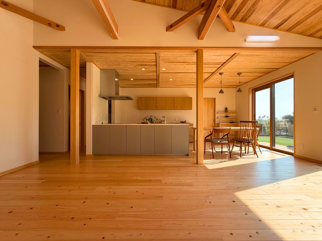 LDKは、平屋ならではの天井の広がりと、視線が抜けるレイアウトで、のびやかな開放感を演出。